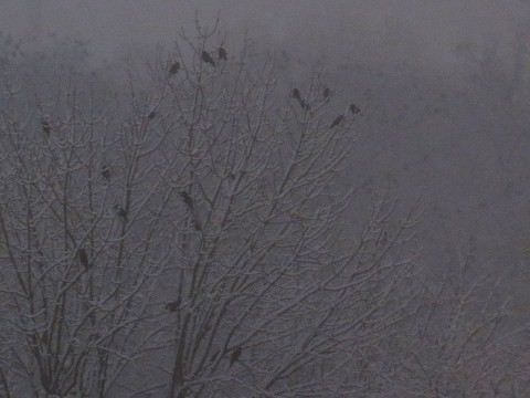 降りしきる雪の中でじっとしているカラスたち。予報どおりかなりの降...