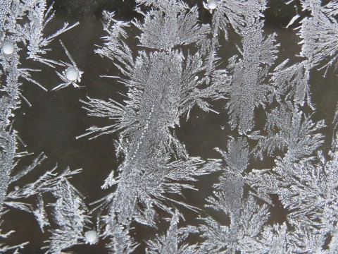 今朝はまたガラスに氷紋が拡がっていました。今日一杯はお天気が悪い...
