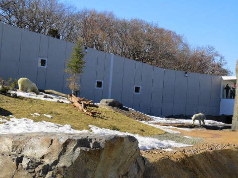 ホッキョクグマ館の雪もわずかになってきました。枝で遊んでいたララ...