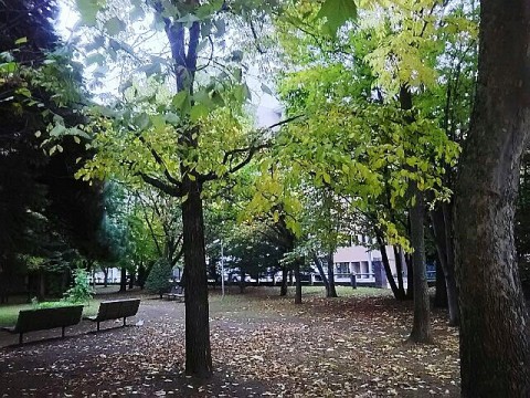 札幌市資料館の裏庭。木々の葉が緑から黄色に変わり始めている時期で...