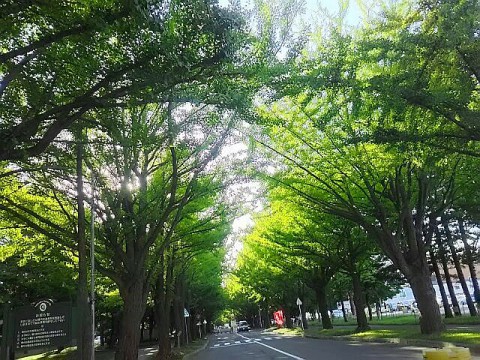 北大のイチョウ並木、まだ完全に緑色です(黄色く見えるのは西日が当...