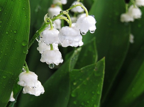 夕方までずっと雨でした。雨に打たれながら咲いていたスズラン。水の...