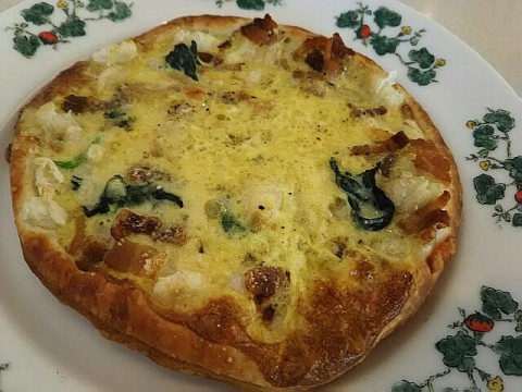 豆とほうれん草の薄焼きキッシュ。直径10センチほどの大きさですが...