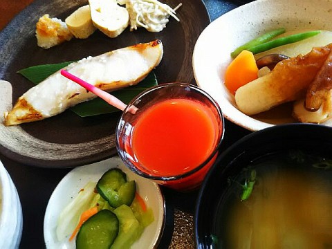 メヌキの粕漬け、煮物、野菜ジュース。コーヒーもついて750円の嬉...