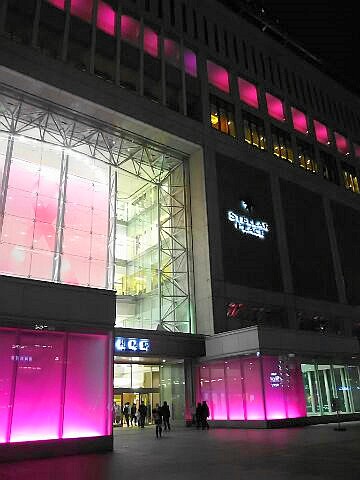 夕方の札幌駅前。ピンクのライトアップは乳がん検診受診を勧めるピン...