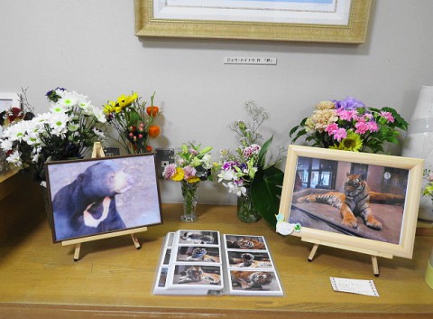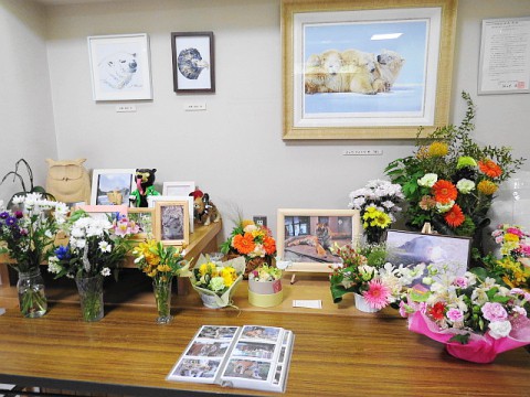 動物園センター受付前。寒帯館の献花台から引っ越してきたお花や新た...