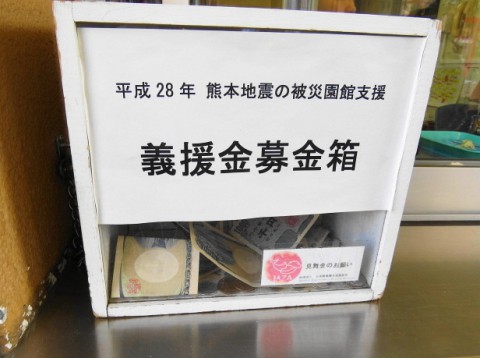 園内に設置された募金箱。遠くから熊本を案ずるみなさんの気持ちが寄...