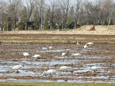 美唄市にある宮島沼は南から北へ向かうマガンやハクチョウが、この時...