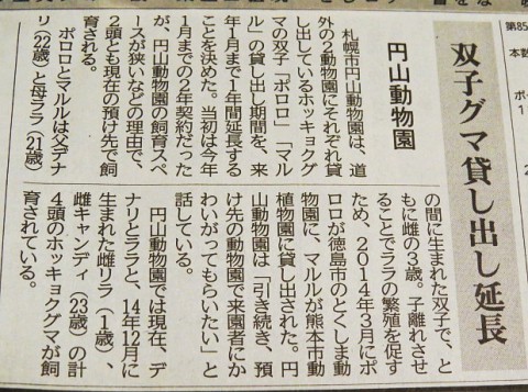 今朝の北海道新聞記事です。リラの姉ポロロとマルルの預託期間が一年...