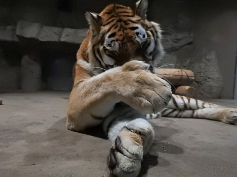 丁寧に顔を洗うタツオ。手もきれいにします。反対側の顔も。更に足も...