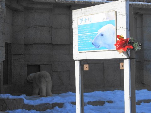 ホッキョクグマ4頭それぞれの紹介パネルにクリスマス飾りが付けられ...