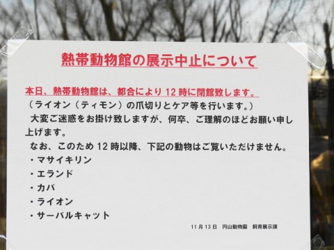 今日は午後からティモンの爪切りが行われました。熱帯動物館は閉鎖。...