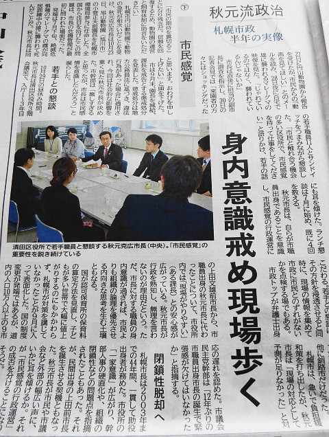 11月7日の道新朝刊です。秋元札幌市長の就任からこの半年について...