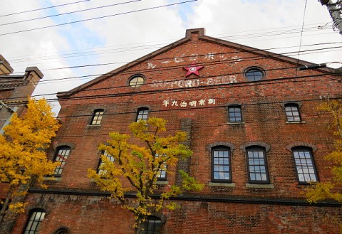 札幌ファクトリーのレンガ館、紅葉が映える建物です。イチョウの葉が...