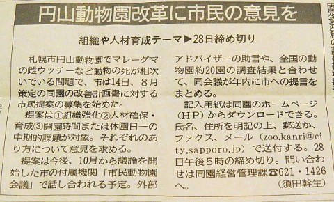 昨日の道新記事。円山動物園の改善にあたり市民の意見を募集中です。...