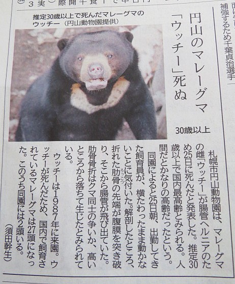 「読売新聞 円山動物園記事」で検索すると円山動物園マレーグマ死亡...