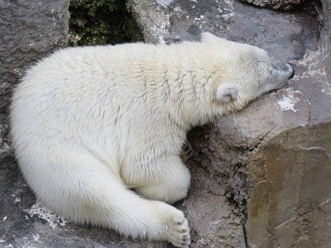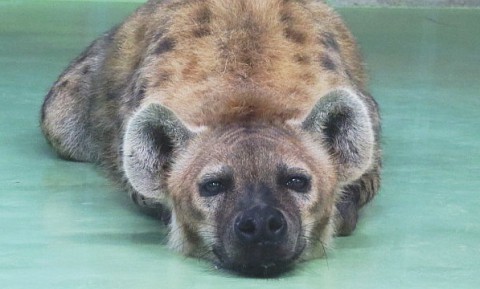 室内では動き回っていることが多いブチハイエナですが、食後の睡魔に...