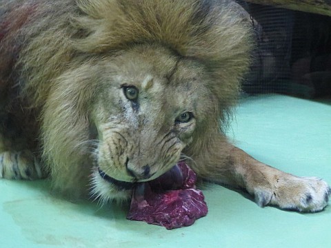 ライオンのお食事タイム。リッキーが馬肉を先に食べ、ティモンは後ろ...