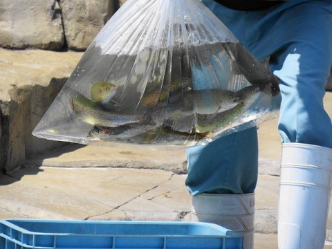 ララ親子にニジマス15匹が給餌されました。コグマにとっては生まれ...