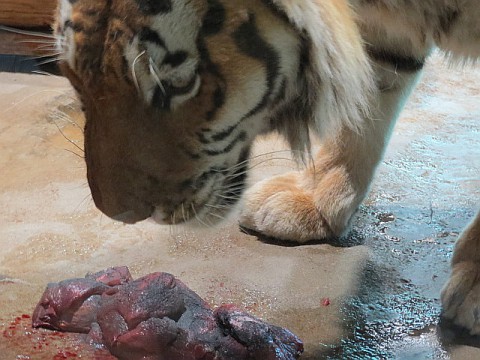 今日はお肉への投薬が再開されていました。この黒い粉末は薬であると...