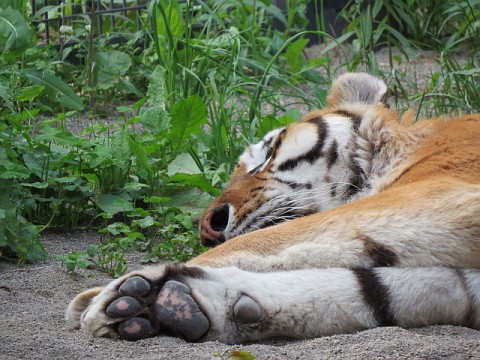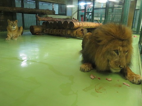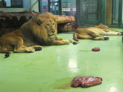 馬肉をほとんど残したまま休憩していたライオン夫婦。ベビーカーが次...