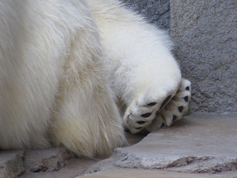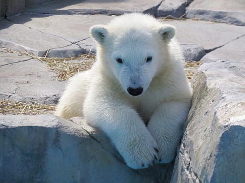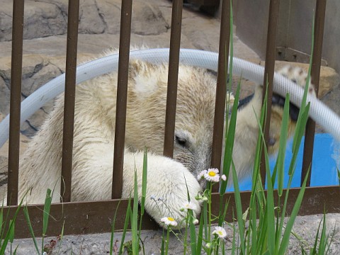 柵の間から手を出して外の物をとりたいコグマ。白い小さいお花に触り...