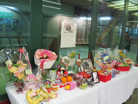 25日(土)に亡くなっていたナマケグマのゴマキ。献花台にはたくさ...