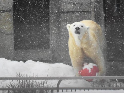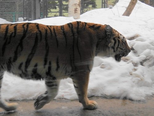 春の湿った雪が降る一日でした。オオカミ舎からズームで眺めるとキャ...
