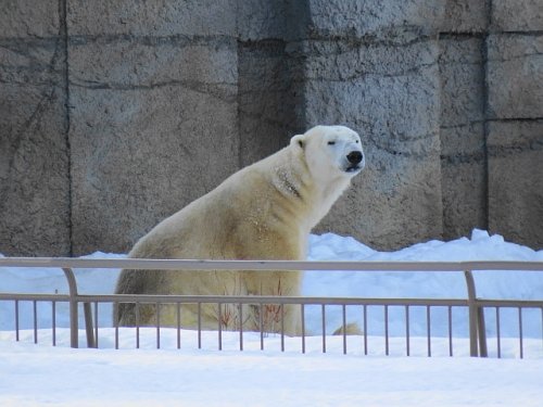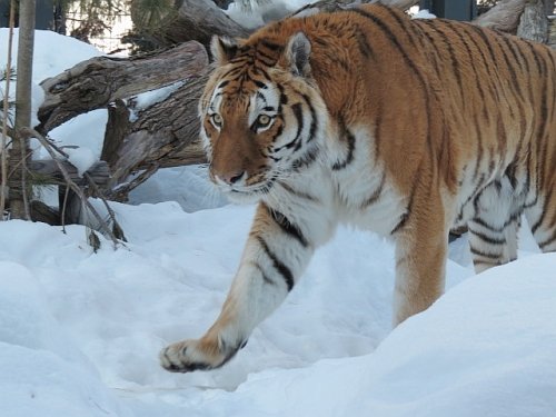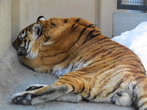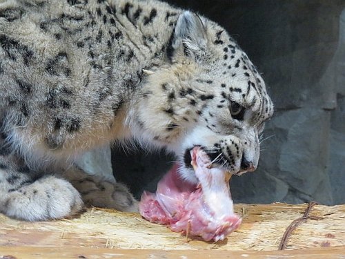 ユキヒョウのお食事タイム、丸太の上で鶏肉を食べるシジム。鶏肉完食...