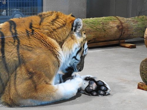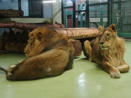 昨日のライオン夫婦。ティモンは床に転がりリッキーはうろうろ。その...