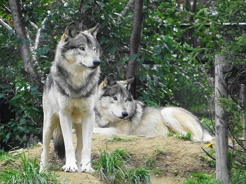 飼育員さんの姿をいつも探しているオオカミ一家。ショウ(左)とルー...