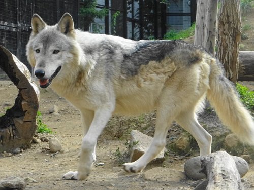 冬に向けて被毛が伸びてきているオオカミ。ジェイも白っぽい被毛が首...