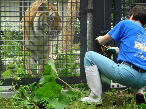 電柵のネジが緩んだようで締め直しをしていた飼育員さん。タツオは「...