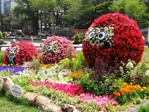 大通公園3丁目にあるベコニアの花で作られただるまさん。手前の赤い...