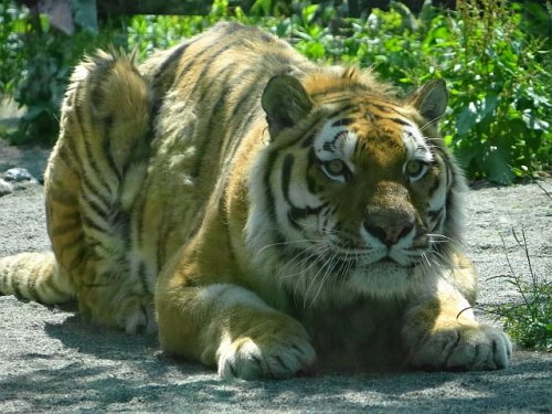 低い姿勢で狙っているタツオ。アクリルガラスのこちら側を飼育員さん...