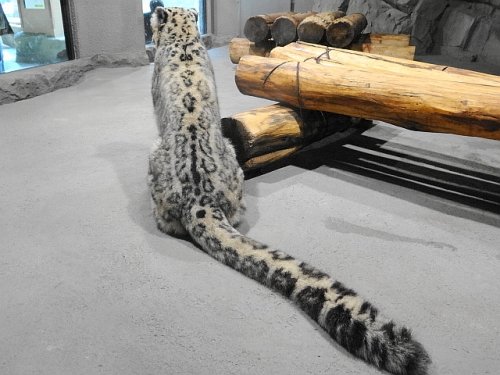 後姿はシジム嬢。ユキヒョウのしっぽは長くて見事です。跳んだり跳ね...
