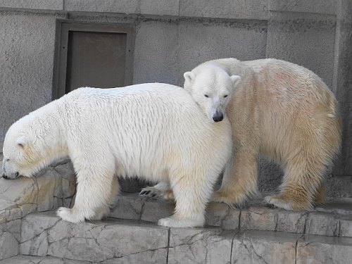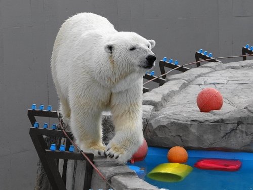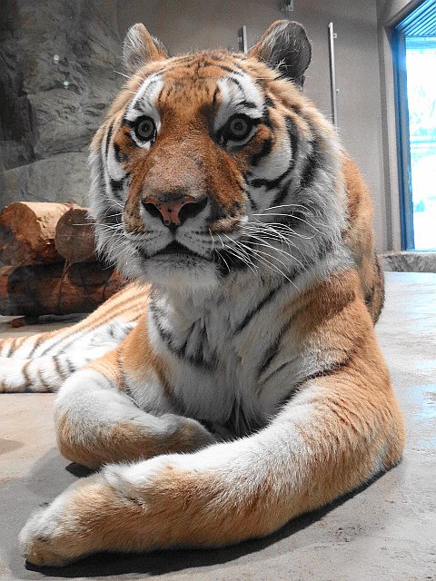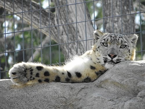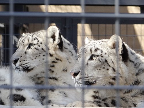 ユキヒョウのサブ放飼場からは公道を行き交う車や人が見えます。犬を...