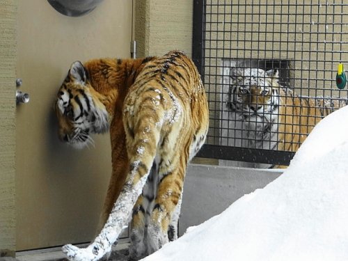 今日は雪が降っていましたのでタツオのシッポもアイの頭も雪まみれで...