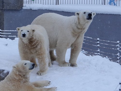 真ん中で鼻先に雪を付けているのがマルル。雪雲がなかなか上空から抜...