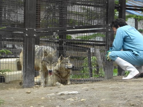 担当飼育員さんと対話中のルークとショウ。今日はルーク3歳のお誕生...