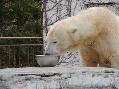 お立ち台の上にあったボウルの匂いをかいでいるララ。中身は空っぽで...