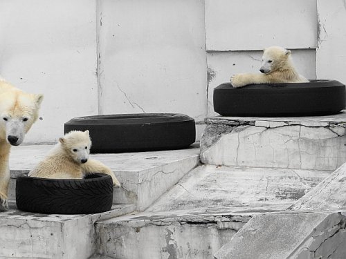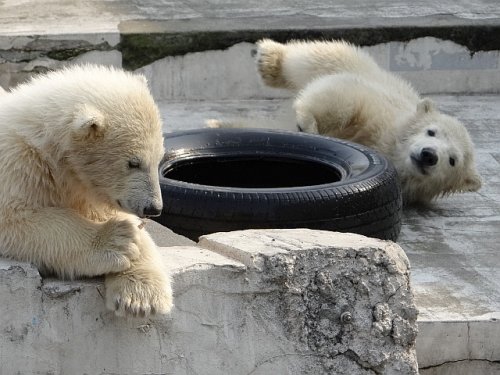タイヤを相手にごろごろしているアールちゃんとプールサイドで一服の...