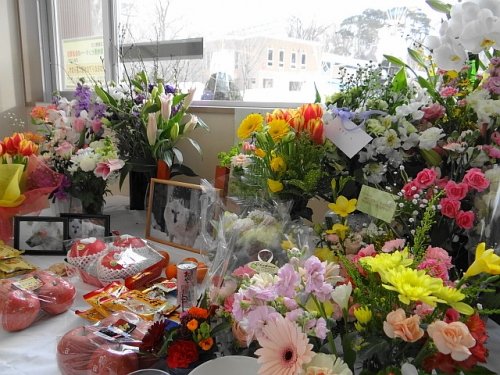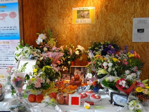 キナコの献花台はお花で埋め尽くされていました。食べ物や手紙など、...
