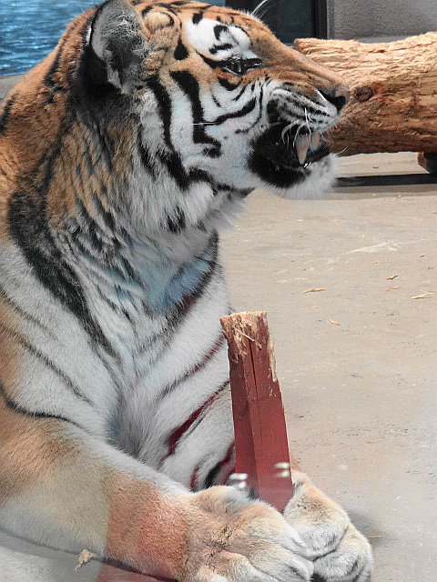 ワイルドに木をかじるアイちゃん後方の台の丸太の下に入っていた木を...