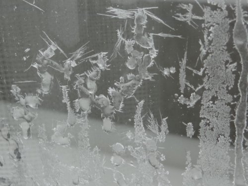 窓ガラスの氷紋です。夕べは風の音に起こされました。今も外は断続的...