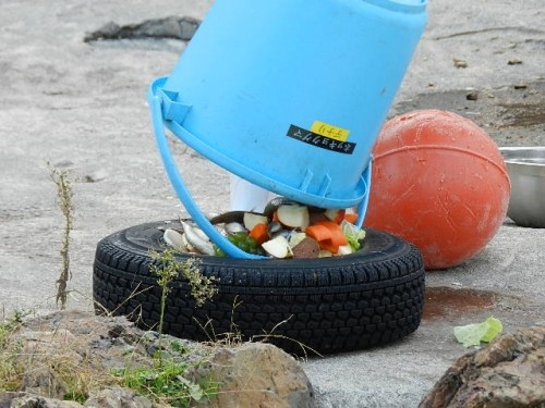 飼育員さんがタイヤの中に魚、馬肉、煮干、野菜などを入れます。食べ...