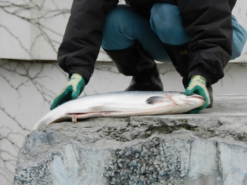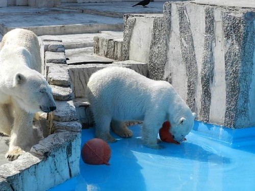 最近ブイを投入してもらうのが習慣になっているデナリ。遠くに飼育員...