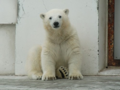 「さぁおいで」とタイヤで誘うララ。ちょっとためらったおちびちゃん...