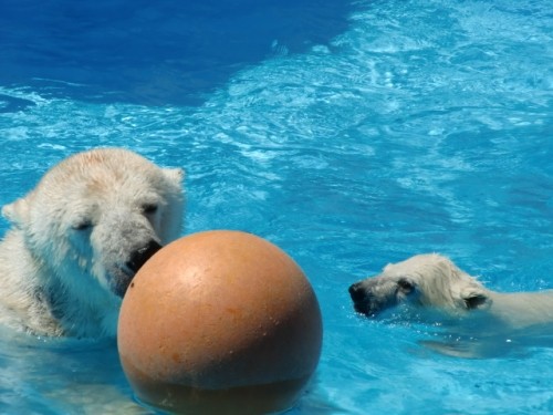今まではプールの中ではブイやポリタンにちょっと躊躇していたおちび...