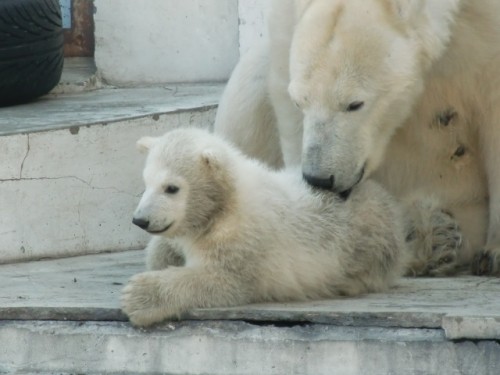 初めてのプールで体もきれいになった親子ララがコンクリート壁に体を...